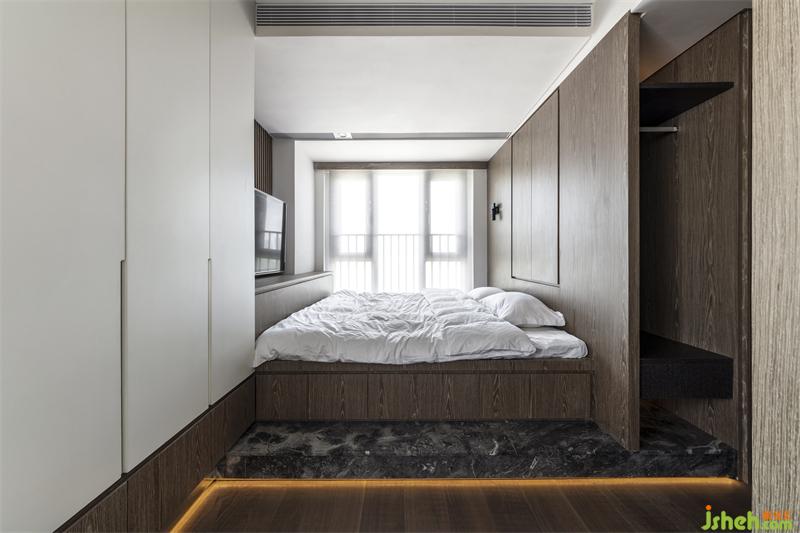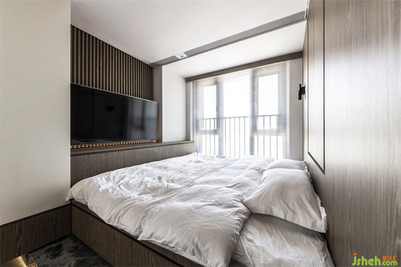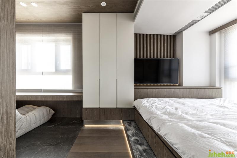 将空间利用率达到极致,主卧延续了宁静的木色,营造静谧的氛围。整个空间没有多余的装饰,简约质朴,窗户透进阳光增添了空间的自然温馨感。