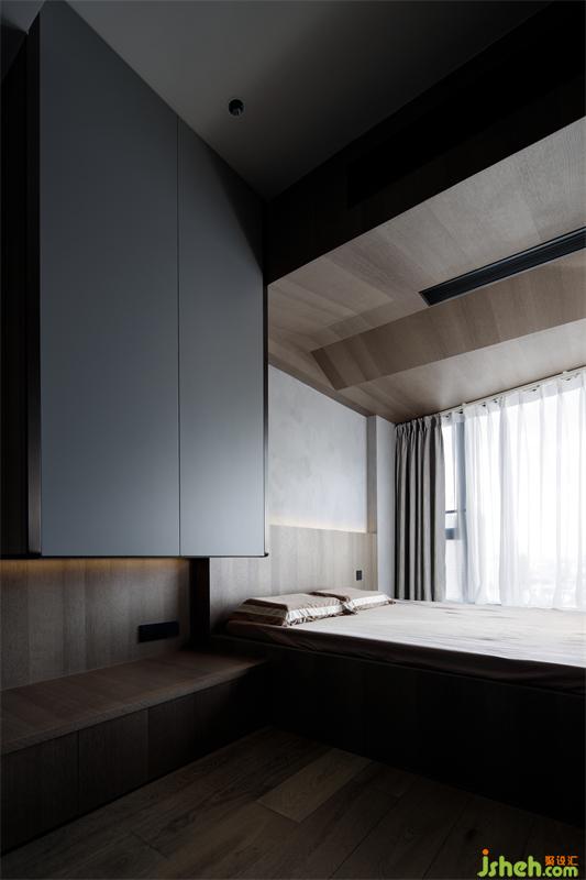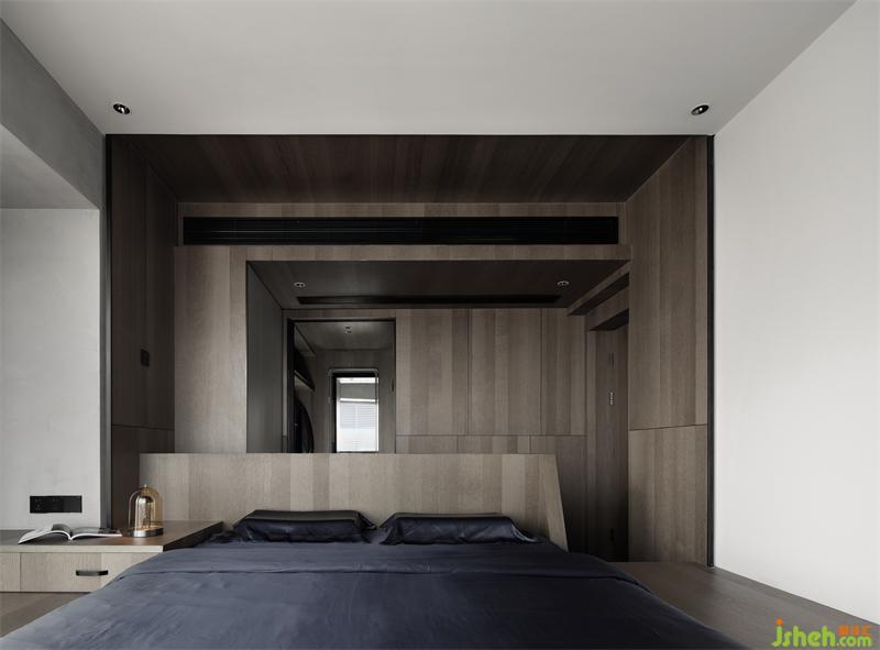 主卧室原来布局过于集中的卧室入口在重新设计之后消隐在浅色护墙板中,木地板的舒适是赤脚行走享受的基础,同时立面简单块面的处理及黑白色的对比让空间多了一份宁静。