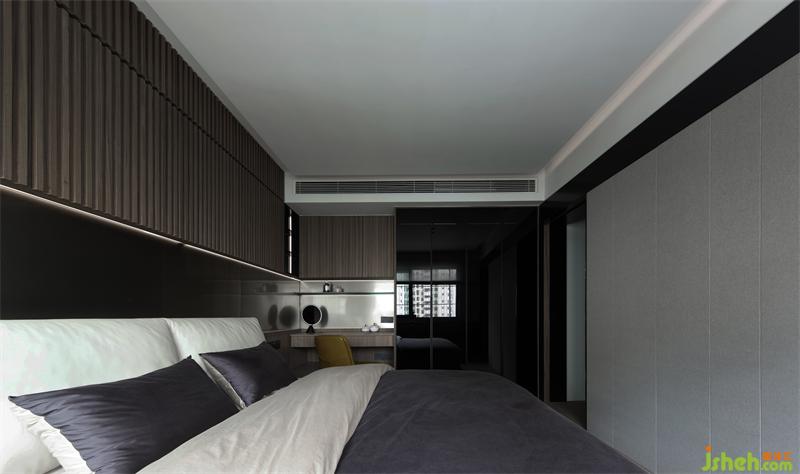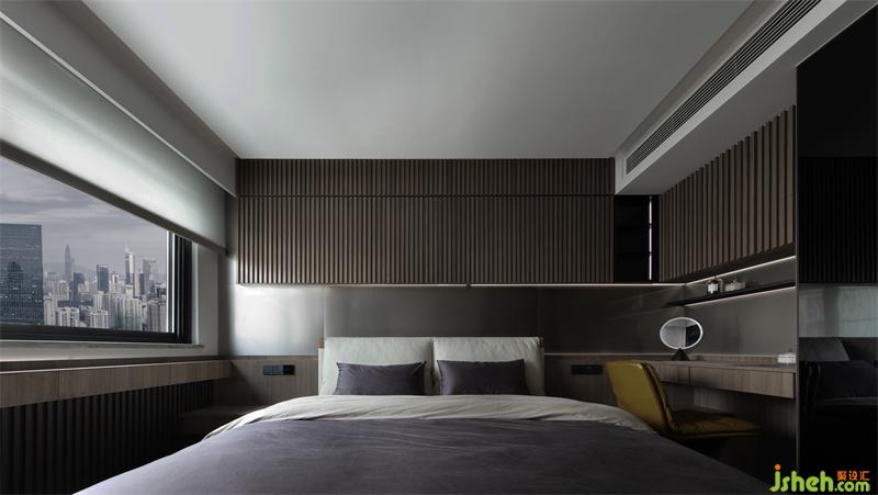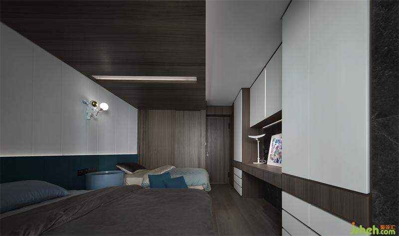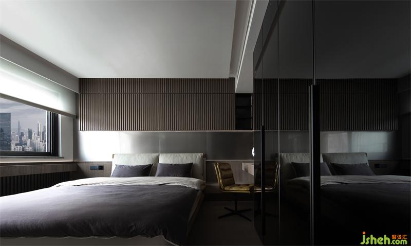 背景以温润的木头材质进行呈现,格栅的肌理与灯光赋予的流动感,创造出丰富的视觉感官。木子仁设计霜灰色床品与墙面搭配出自然的层次感,而延伸的柜体在有形与无形之间达到了隐形效果,让空间看起来更加洁净有序。