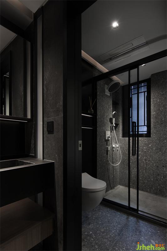 黑色石材大面积铺贴为空间注入安稳的气氛,利用百叶窗将阳光进行过滤,空间在与自然融合过后显得更轻盈氤氲,让使用者拥有对生活更细致的体察。