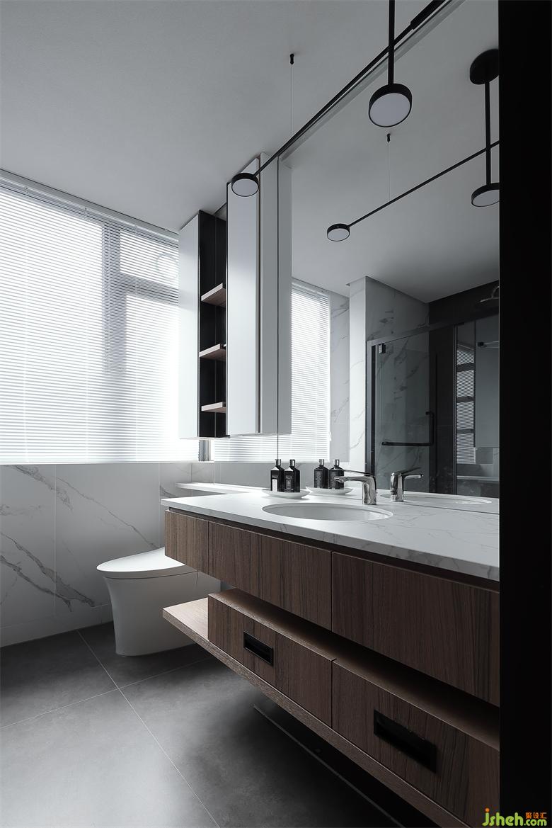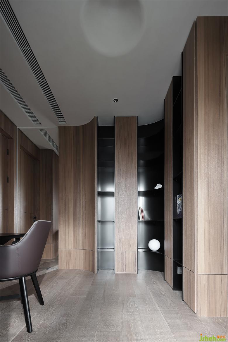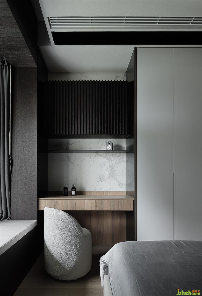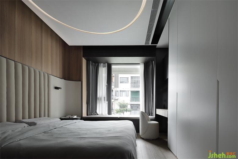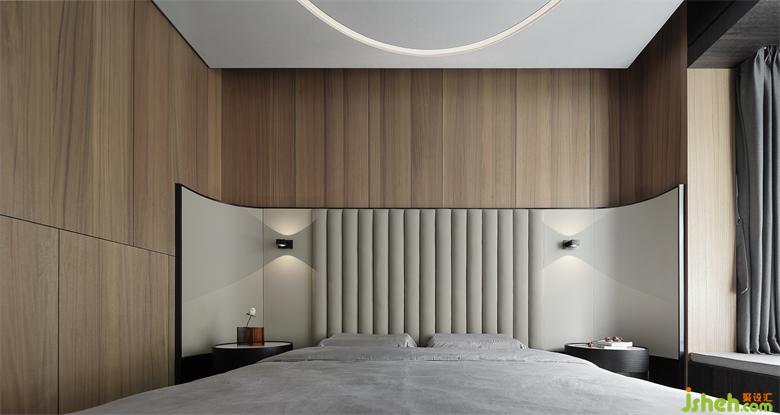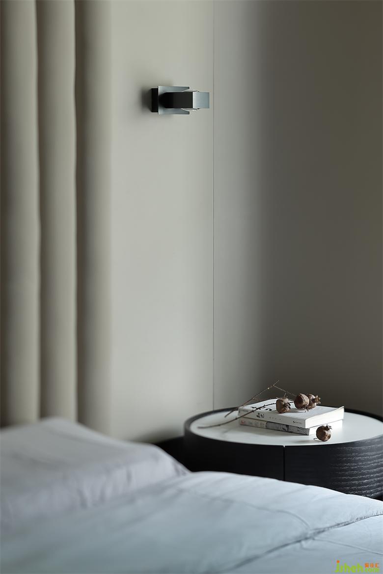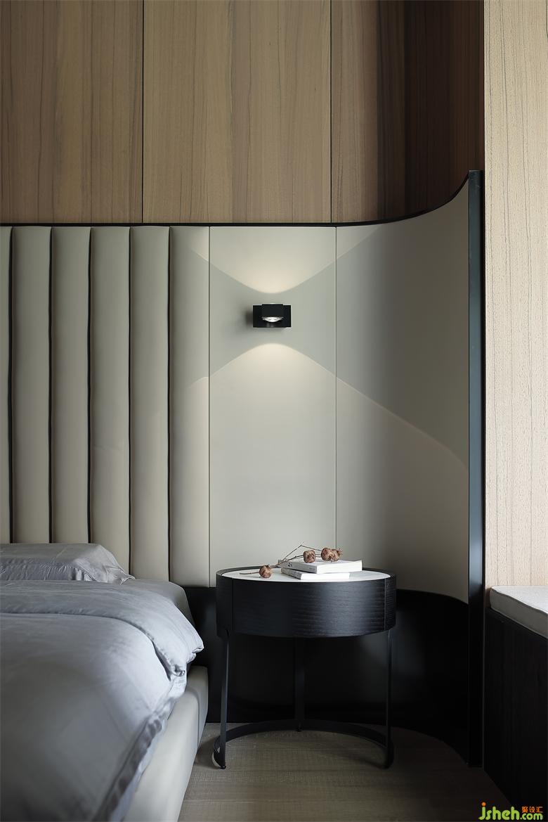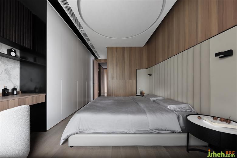 主人房的设计,在自然之境的主题下,天花的圆似苍穹,点线面的勾勒组合将空间功能简单的表达,有温度的质感的软装单品,点到即止,时尚与质感的交融,展示屋主的品味喜好,金属、木饰面和房屋中大面积白色形成碰撞和交汇,给房间增添了自然的生命力的同时却又各自成景。木子仁设计主卧与主卫形成套房设计,隐藏门和木饰面墙体连成一体,功能各司其职却又和谐共存,竖木纹的悬空柜子和过道设计手法一致,光深浅交织交织出和谐的画面。