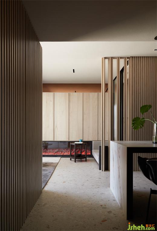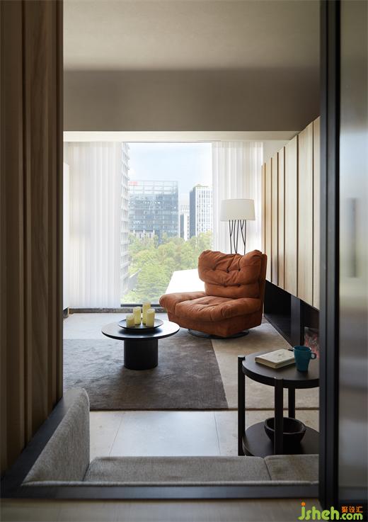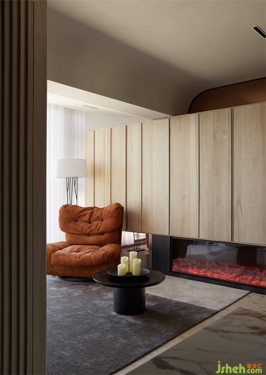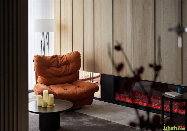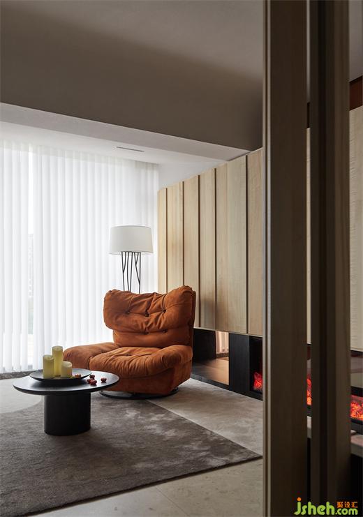 客厅面以一个现场制作木格栅为屏风的工艺呈现,有着粗犷的感觉。黑色的几何形制桌体搭配简约卡座,豪宅设计配上黄棕色温暖色系单人沙发,简单不失温馨,颇具意境。