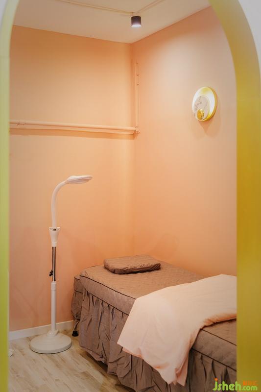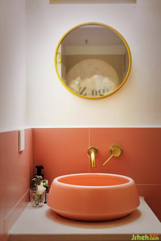 室内采用圆形、半圆、凹陷和凸起等几和形细节,几何形结构为空间增加了层次感。颜色当然是少女色啦,床的深棕色与之搭配,并没有感觉到暗沉,反而是一直沉稳舒适的感觉。卫生间采用台上盆,金属质感的水龙头与橘粉色的台盆搭配,制造少女情怀。