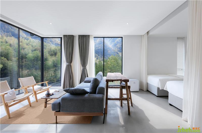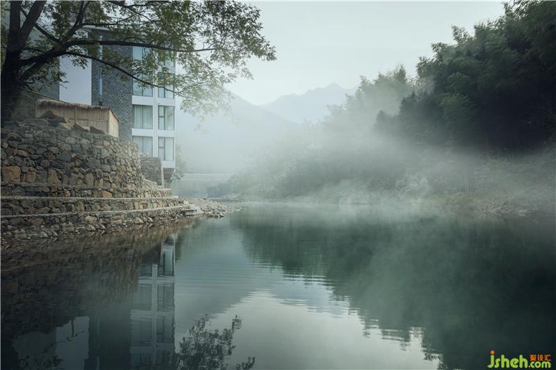 觅源在空间上营造了一种侘寂之美,灵感来源于皖南乡村白墙灰瓦的传统民居,建筑保留传统自然生活方式的理念,在溪流与山坡的环绕中显得安静空灵。