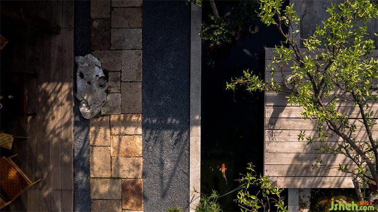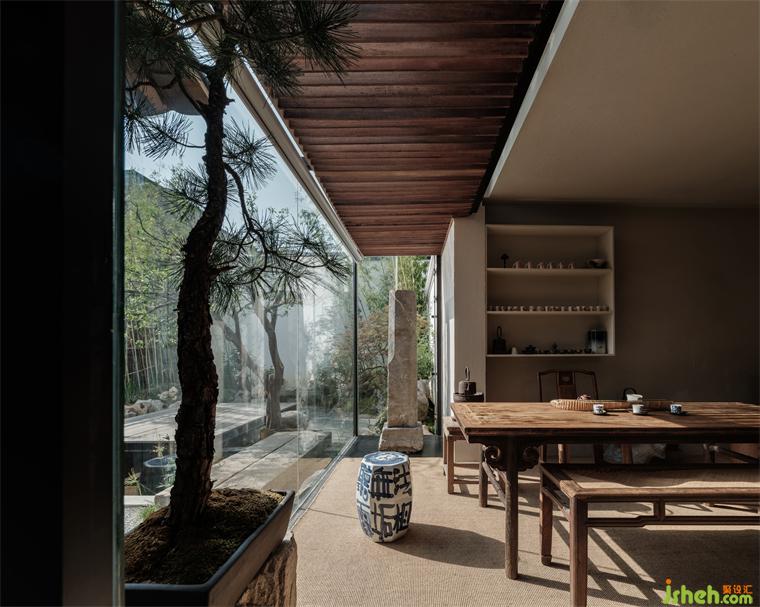 右手房屋下有大大的屋檐,檐下有张矮桌。可品茶,可饮酒,可高坐,可酣卧坐在檐下,桃花坞院子设计抬头看见天空蔚蓝,流云聚散。四百年前的唐伯虎,看到的天空,和今日当无二致。