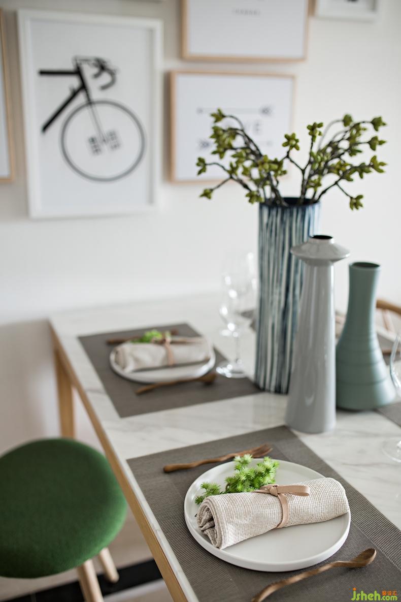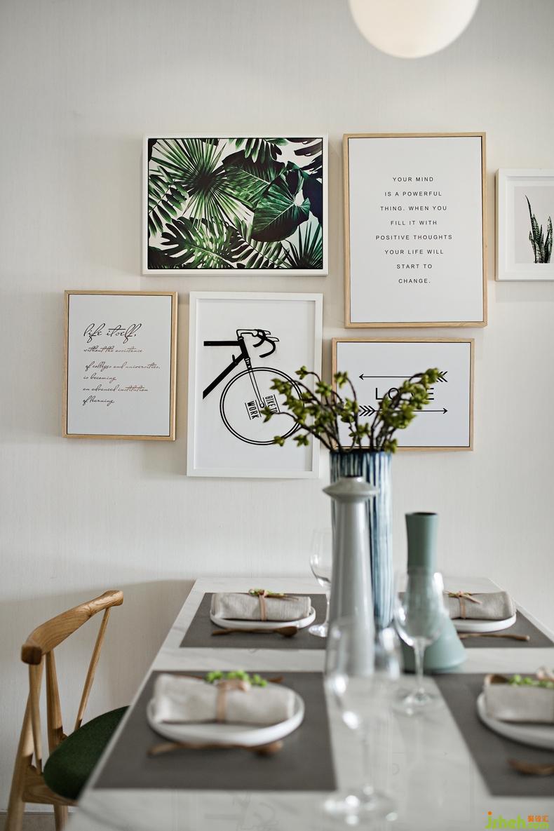 餐厅木质餐桌椅子、布艺软垫、陶瓷餐具自然主题挂画组合每一个细节的铺排都呈现出令人感觉舒适的气氛,整体空间演绎着优雅自然的生活美学。