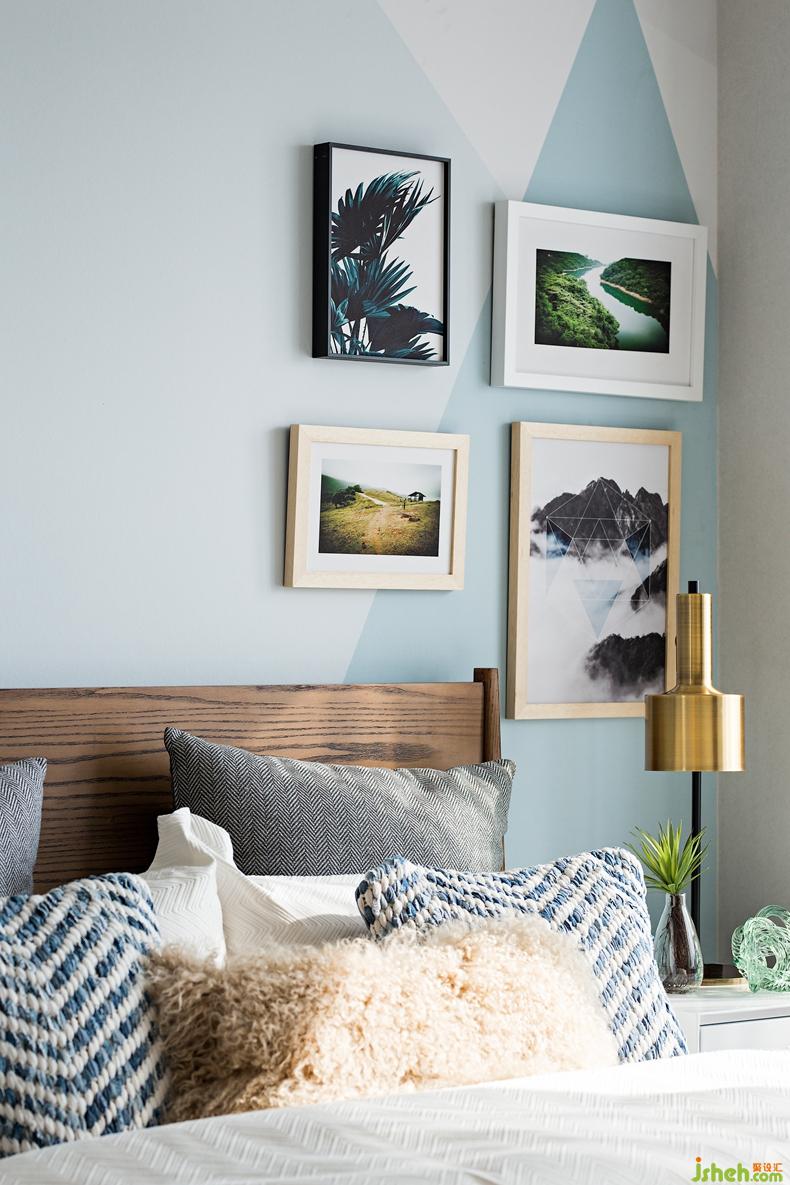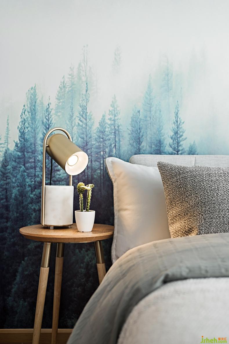 卧床头背景墙运用抽象几何图案迷雾森林景致墙布,如层层叠叠的山峰、丛林,强调情境化氛围的营造舒适高端的定制床品布艺,深圳设计公司布局别致的挂画、绿意盎然的盆景都充满着错落有致的节奏感无不精美点题。