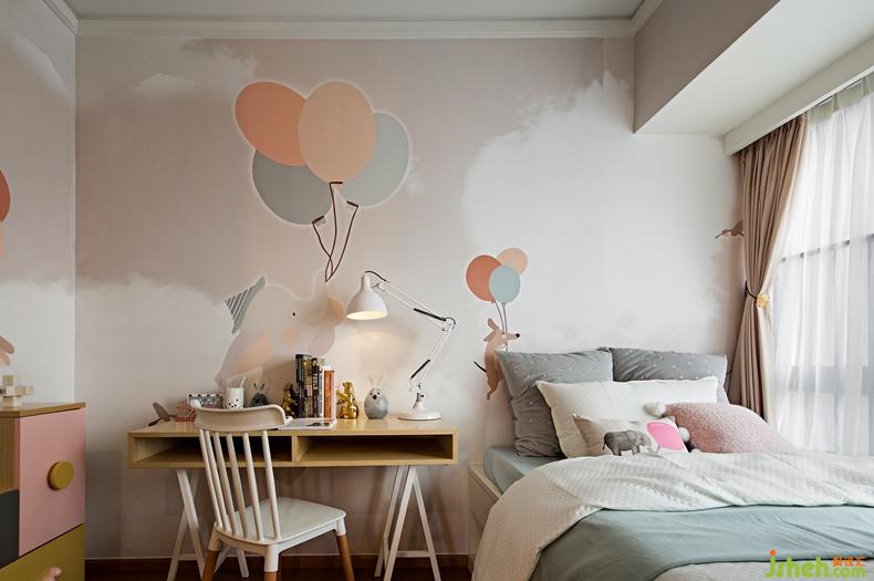儿童房色调温馨,储物柜尺度设计上满足小孩的使用,造型配件又设计得别致有型,各种小动物墙纸童趣十足,营造出充满想象的舒适空间。