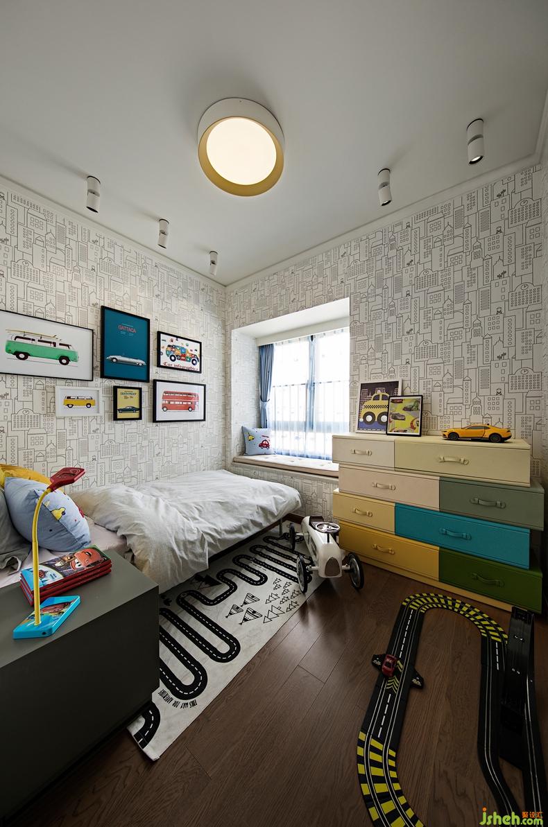 城市主题墙纸搭配车元素挂画组合,赛道地毯、抱枕、台灯、车模摆件等,丰富的空间层次感且童趣十足完美地演绎了汽车主题儿童房,设计同时留出最大的活动空间,让孩子可以在此尽情的玩耍。
