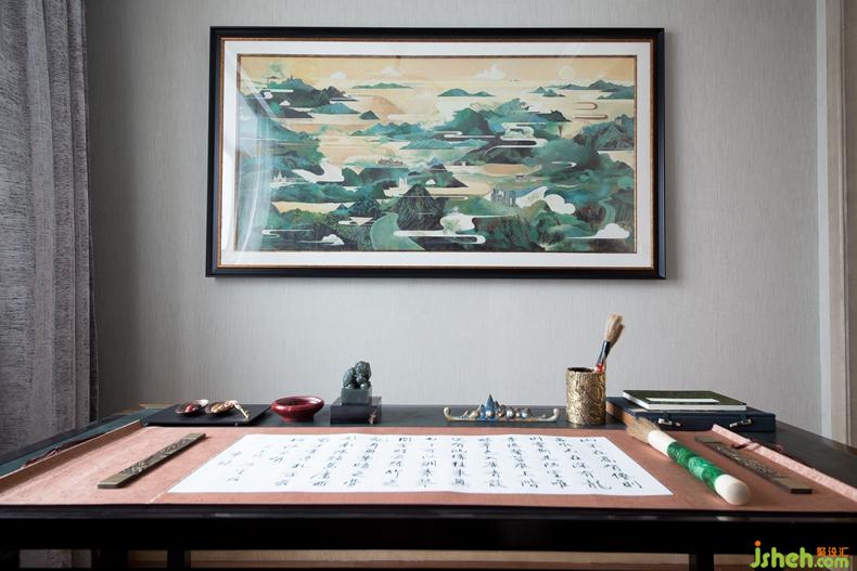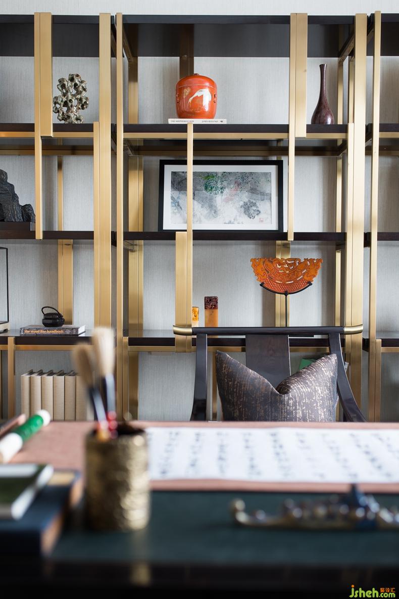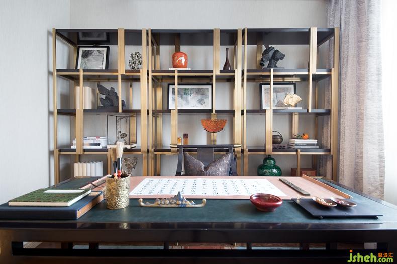 书房书柜设计集储物展示一体,设计公司甄选精美的装饰艺术品,文房四宝,瞬间成为空间亮点,东方印象使人回味无穷。