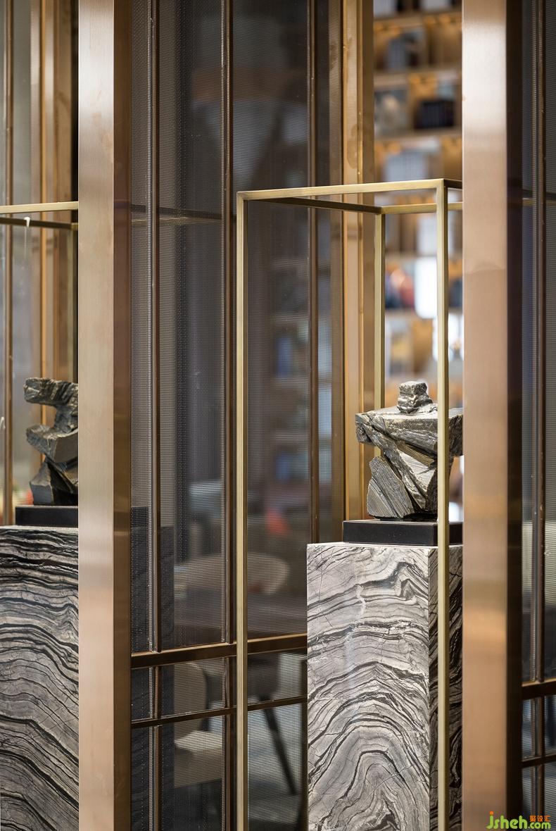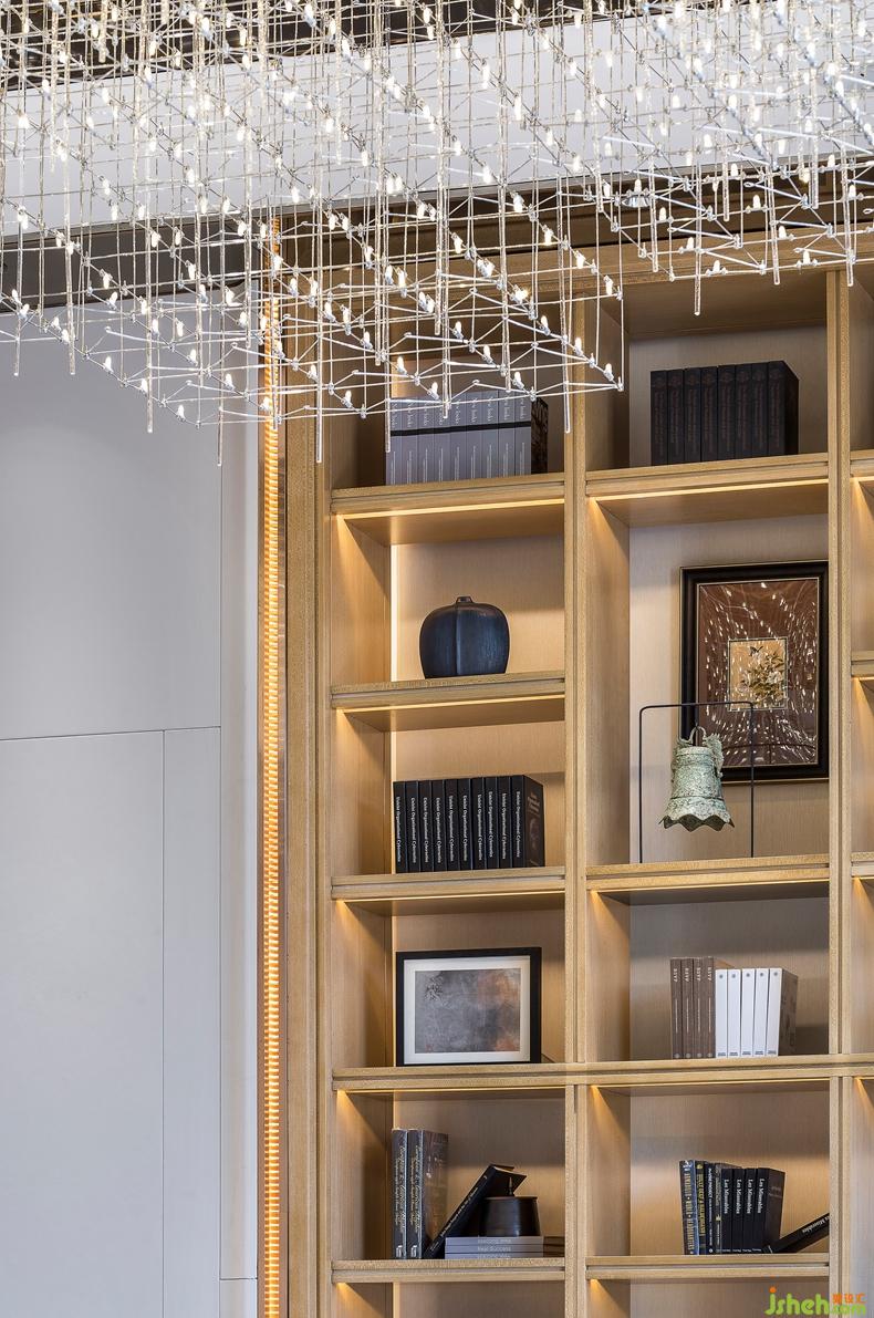 甄选装饰艺术品与书籍置于展示墙,打造出一个富有跃动旋律的礼仪空间.