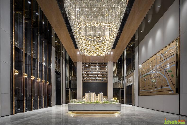 沙盘展示区大型艺术吊灯与简洁明快的整体空间效果相得益彰.