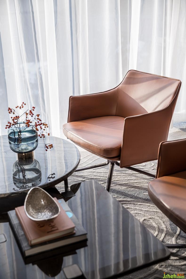 家具造型呼应硬装的几何线条感,纯白纱幔、优质皮革沙发、大理石金属茶几,与橘色单椅搭配,呈现一种坚硬与柔软并存,光洁与沉稳并呈的特殊质感,彰显了空间并不张扬的奢装理念.室内设计师