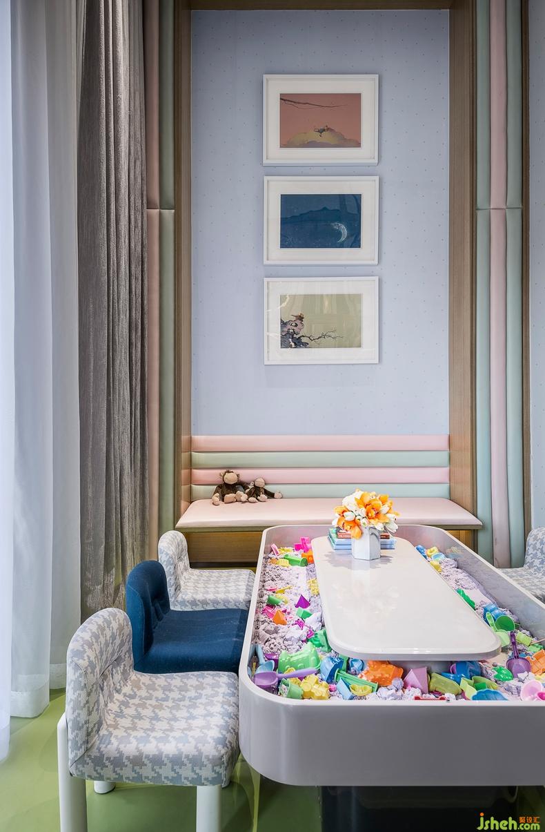 儿童游乐区丰富的色彩,创意组合挂画散发着优雅且神秘的气息,充满童趣的家具设计,构造出童话般游乐空间.室内设计师