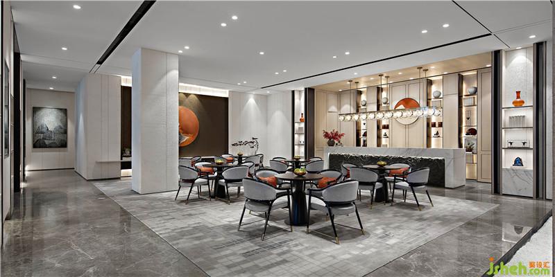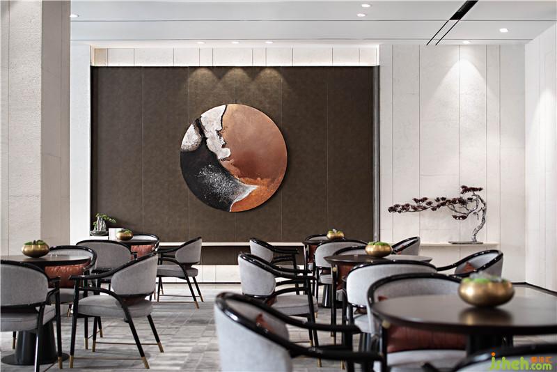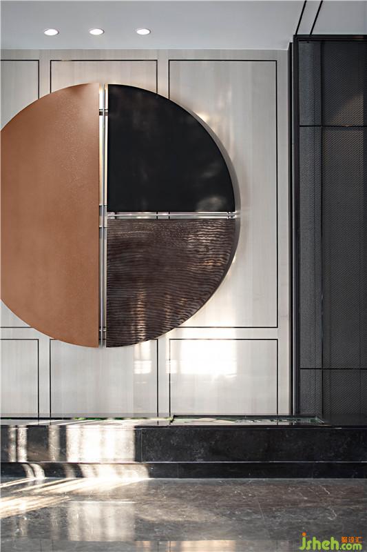 洽谈区空间基调极具视觉张力和仪式感,台面上的金属迎客松雕塑,借景寓意东方,迎接八方友客。室内设计师