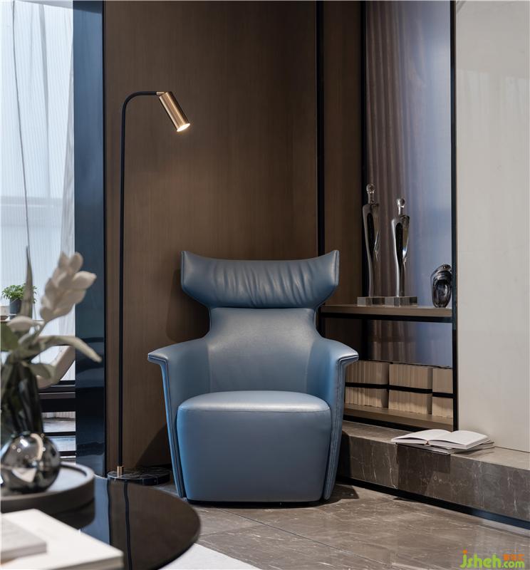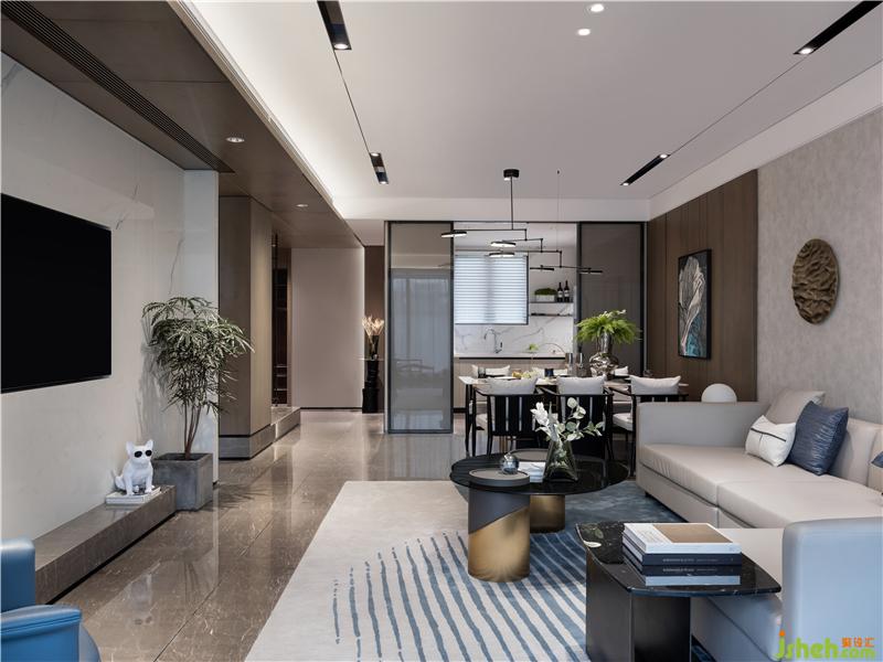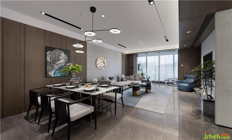 室内建筑化的设计手法,样板房设计使空间更具有立体感,啡色的大理石地面,深褐色木质配搭,米灰色沙发及极具奢华质感的古铜镶嵌,为空间渲染出沉稳的基调,焕发静谧的氛围。构成了一幅品质感十足的空间画面。整个项目,不同的空间需求展现了各具特色的氛围,契合人类情感的变幻,带来精神层次的对话。