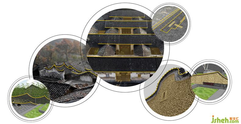 巧妙的运用岭南特色文化元素山墙、斗拱、青石板、青砖、瓦片、蚝墙、农具、岭南雕花、琉璃拼花等,通过设计重构,融入到景观设计中,点滴细节皆是岭南文化的缩影。