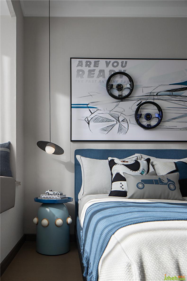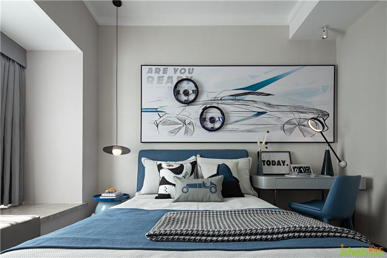 海蓝的梦幻应用到儿童房充满着无限的梦幻,墙面的视觉展示着孩子对未来的展望与探索,阳光的包裹更让孩子可以在随意畅想的环境中无忧无虑,鲜明的空间让人感受到缤纷雀跃的而又充满活力。样板房设计