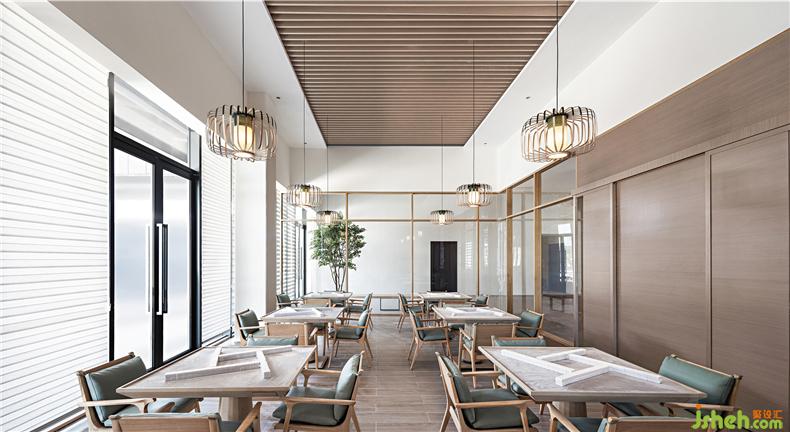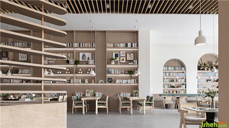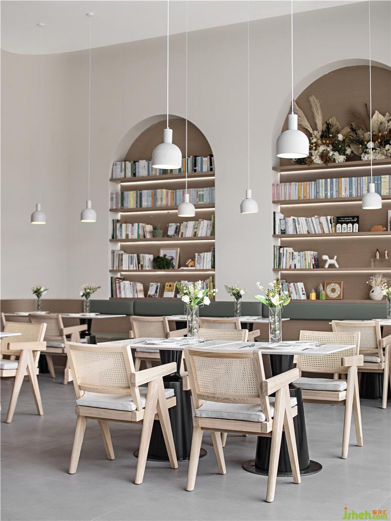 餐厅区丨如风轻柔,如光自由,圆拱形的书幕墙略带复古意蕴,齐整的餐桌餐椅极具生活中的仪式感,半包的卡座被自然环抱,简洁的器皿点缀细节,舒缓的氛围刺激感官,让身心都得以放松。
