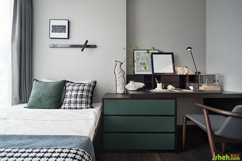 烟火成书,同时也记录着关于爱情的幸福模样,家的理想状态在于塑造生活的仪式感,灰调的沉稳优雅搭配墨绿的开阔调色,让生活的旋律在主卧的极致中更像一场田野的漫步,让爱手牵手的荡漾在感性与理性并存的搭配之间,温暖治愈,余韵悠长。