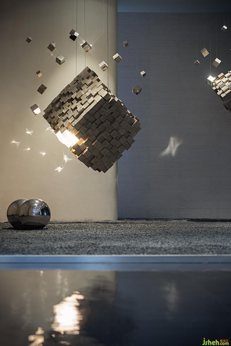 《浮石》装置丨 当科技量子化身无限的宇宙魔方,带着星光闪耀的垂坠散体,样板房设计拓展着整个空间的无穷无尽,简约却又创意十足的构成设计,打造着极聚视野焦点的吸引力,光影亮起,仿佛穿梭时空的未来幻境。