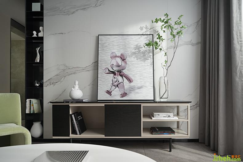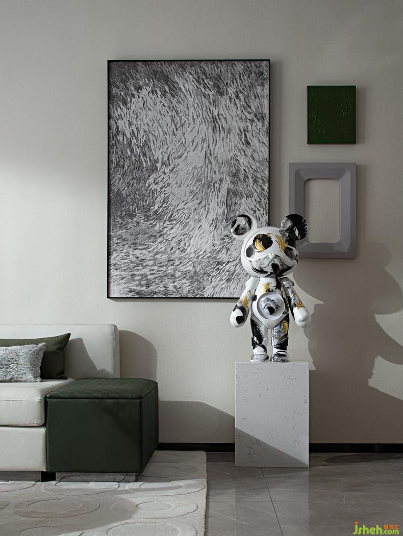 全景落地窗让光线被最大化的保留,同时也打开了探索的视野界面,素色的布艺沙发,立体的抽象挂画,星际熊的潮流人偶,都是居者对生活热爱的呈现,无需繁复的色彩,即能铺陈无限的想象,进行一场与乐趣与热爱对话... ...