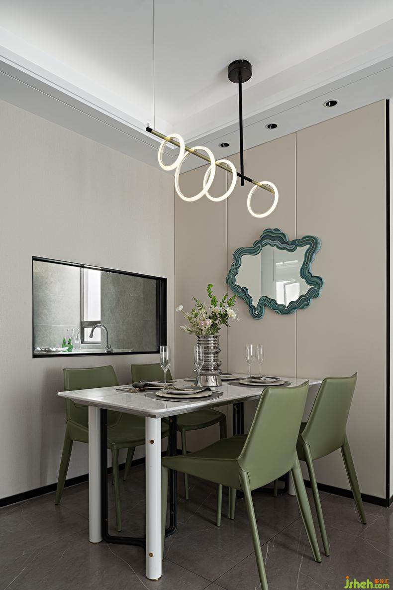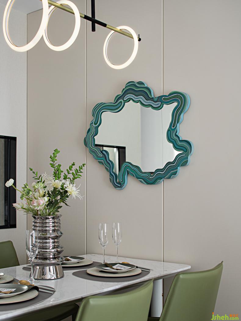 对潮流的热爱总可以在餐厅区域有着超越时空的呈现,创意十足的环装叠加式顶灯,样板房设计不规则的空间浮雕餐边镜,搭配着让视野足够舒适的星云绿花艺布景的桌几,简卓设计的餐椅让餐厅跳脱出传统的认知,每一处细节都是作品。