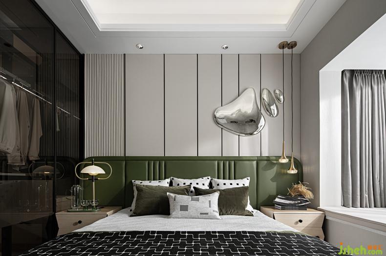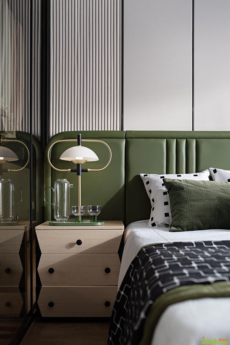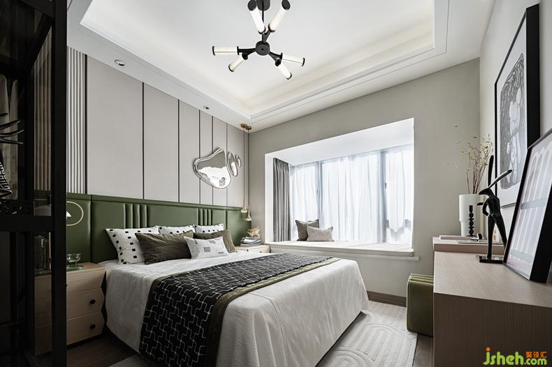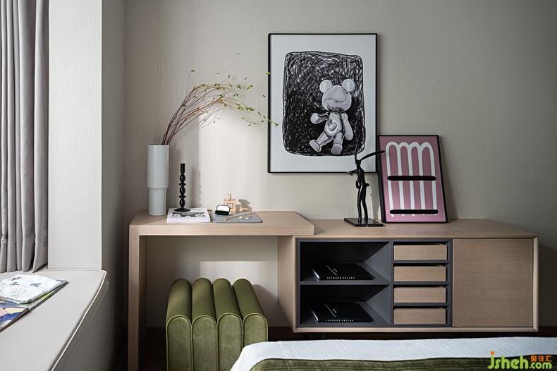 进入主卧印入眼帘的即是它通透的格局和质感的肌理,星云绿的色彩聚焦搭配着素色拼贴的几何线条,阳光透过飘窗落入室内即有最舒适的关系色彩,打破时空的局限,辅以创意感十足的灯具置景和居者热爱的星际熊潮流作品,生活即是乐趣。