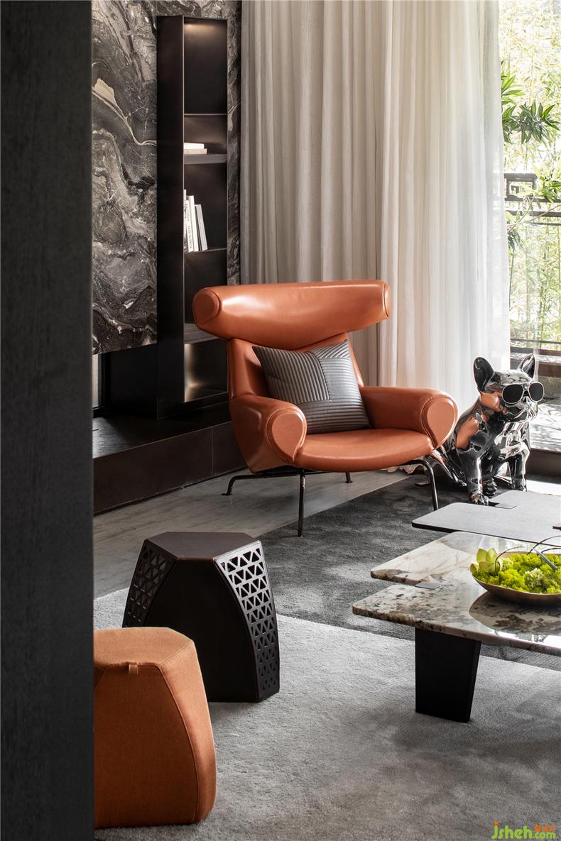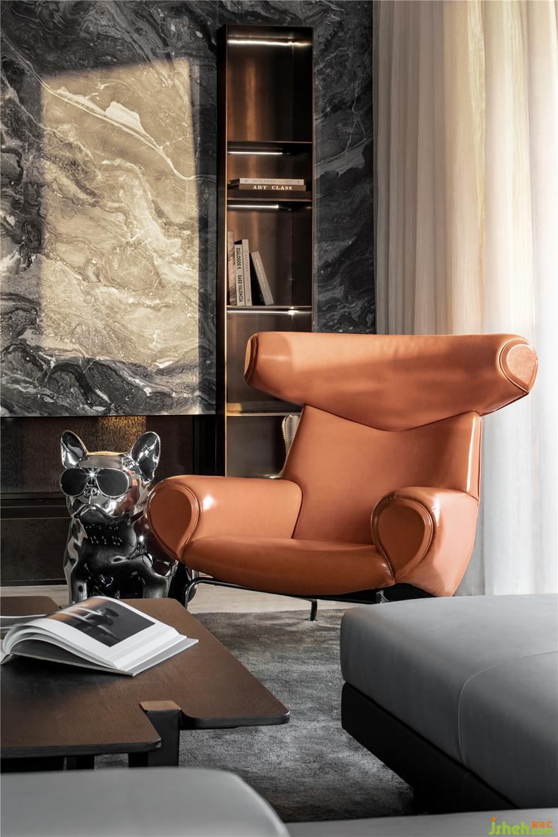 大理石、木纹肌理、皮质、分别呈现出硬、中性、软,以及冷、中、暖的质感,空间内三种材质的碰撞出“刚柔并济”的氛围,在“奢居”中隐喻精致,在“简居”中勾勒活力。