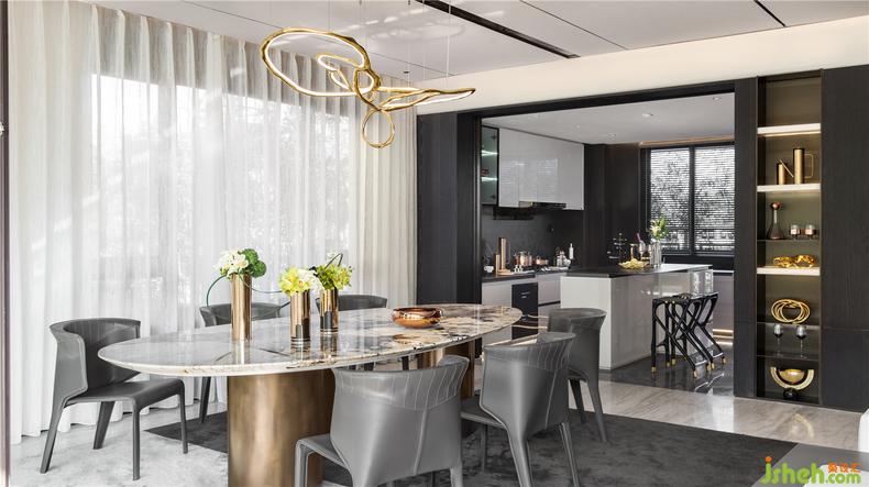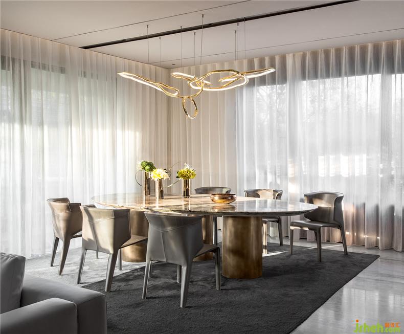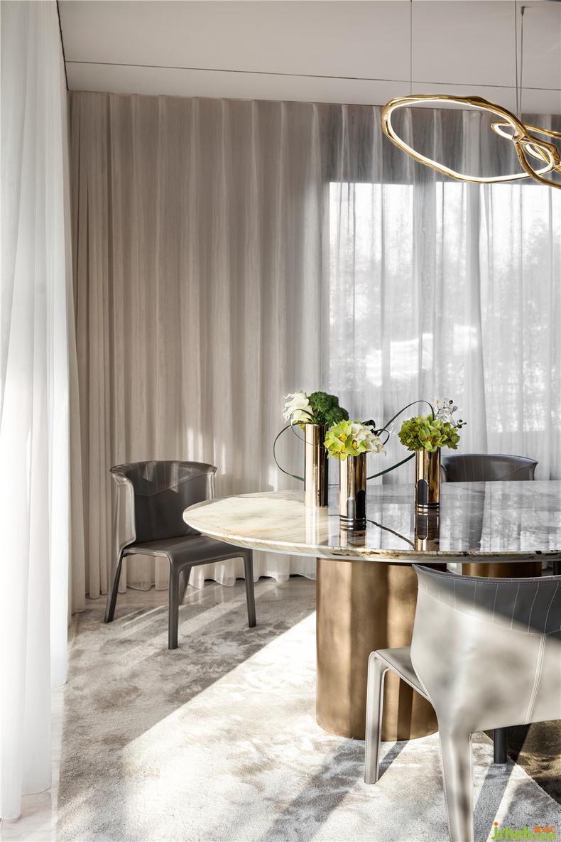 餐桌与吊灯的弧形线条连接客厅的克制与餐厅的优雅,起到过渡与中和的作用,金色硬挺的金属质感可以产生稳重夺目的视觉效果,同时令空间的整体色调更为自然与和谐,光线照射进来,呈现如戏剧般的独特感受。