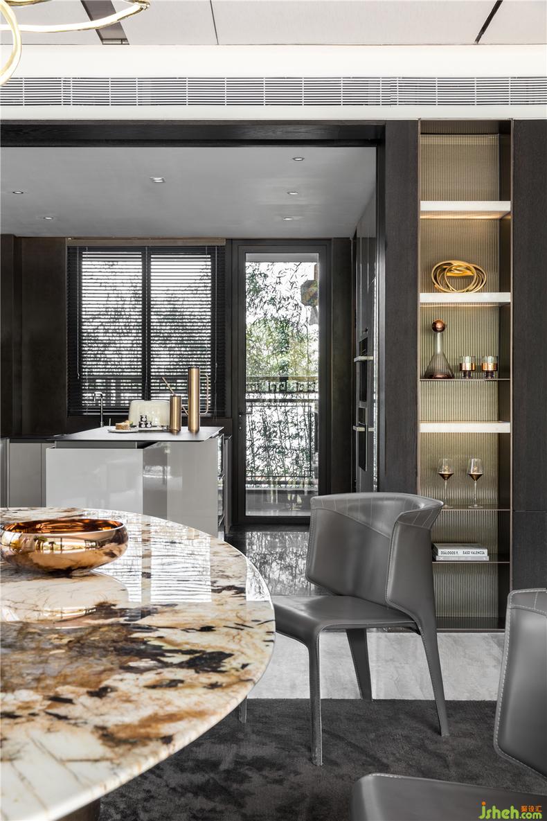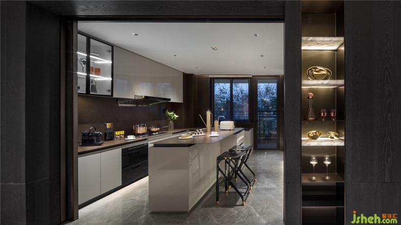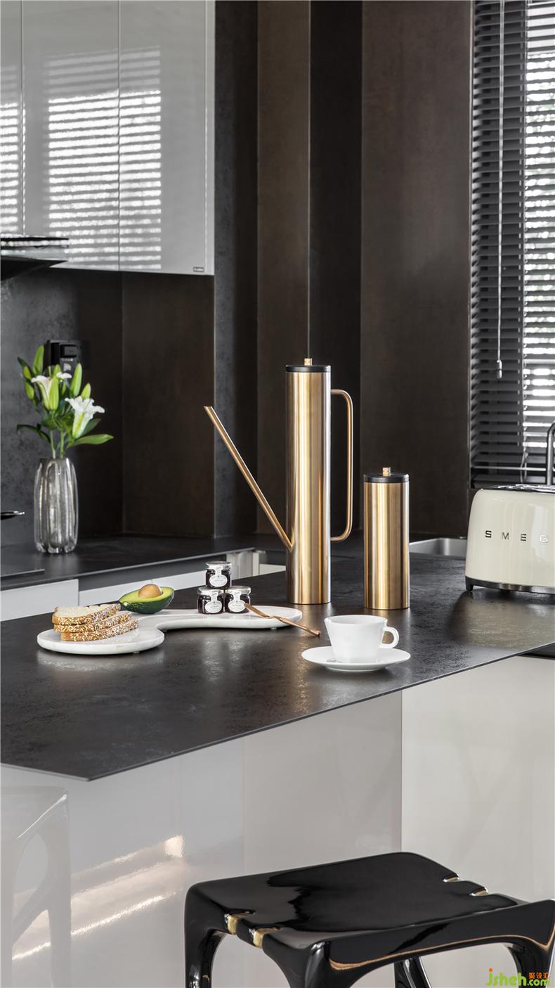 当视线转向厨房内,既延续了客餐厅的低调华丽的感觉,木纹肌理与灯光搭配出沉静深邃的感受,在原本克制的空间氛围里在加入了金色暖光与家居配饰后,视觉效果得到了极大的丰富,空间平衡感和温度感也增强很多,餐具与器物尽展材质与线条之美,如生活中最本质之处。