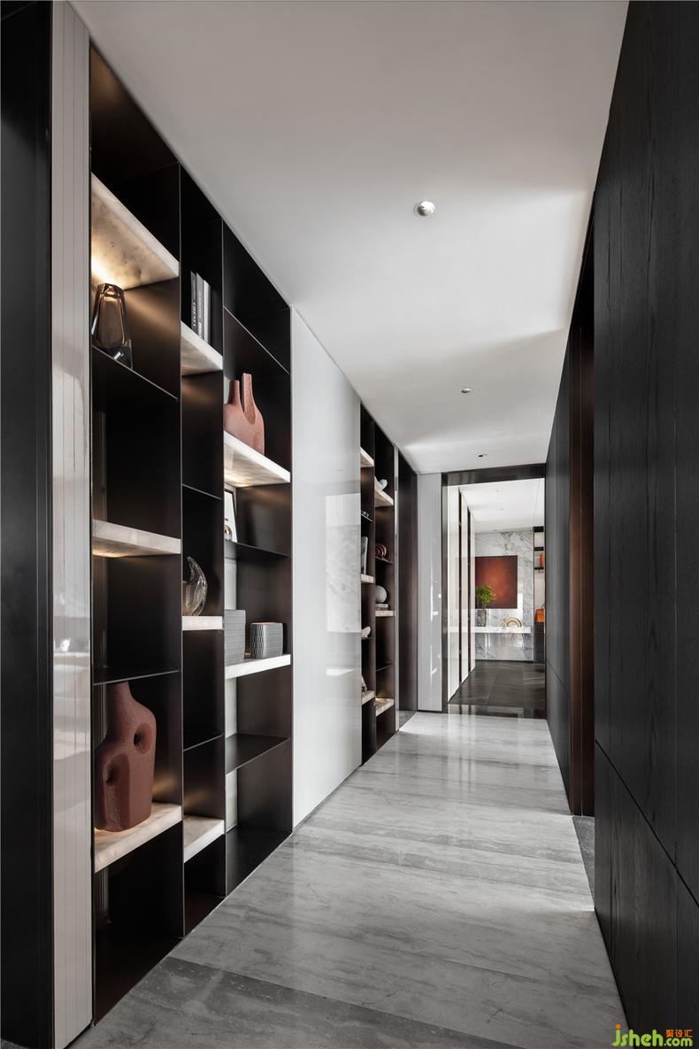 室内设计师合理的收纳空间以艺术填补,线条与材质游刃有余地在柜体里游走,展现空间对“高级感”的理解。