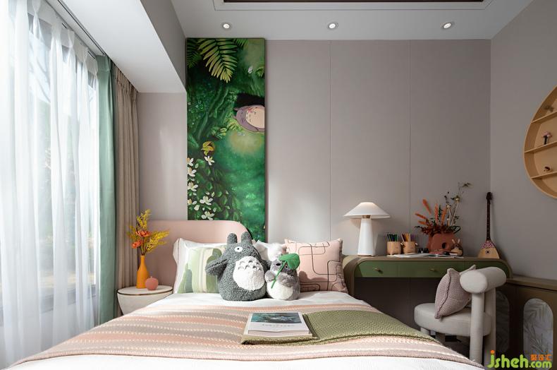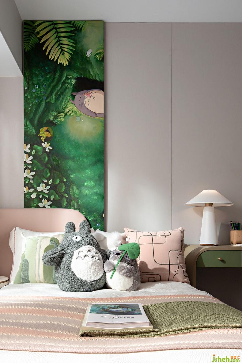 儿童房丨墨色系与清新的粉绿结合,搭配森林元素更显清新童趣,样板房设计可爱的龙猫玩偶是小朋友的最爱,空间内的家居圆润柔软,营造一个鲜活充满着爱意的氛围,呵护着小朋友们的健康成长,