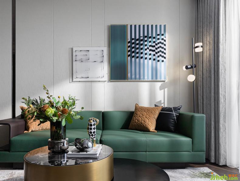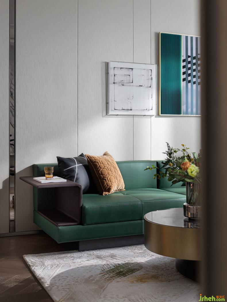 客厅丨热情与冷淡,硬朗与温柔,率性与谨慎.....室内设计师在不断地平衡与取舍中混搭出“家”的趣味性。大胆的墨绿色皮质沙发赋予空间时尚又复古的气息,金色和奢橘的调和出精致感受,现代的灯具与装置,给你一个宅在家的理由。