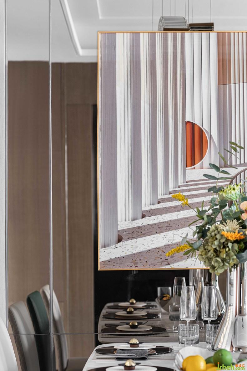 餐厅丨延续客厅个性的调调与氛围,金属玻璃器皿与艺术挂画增添品质生活的格调,让整个空间的状态提升到另一个美好层面。