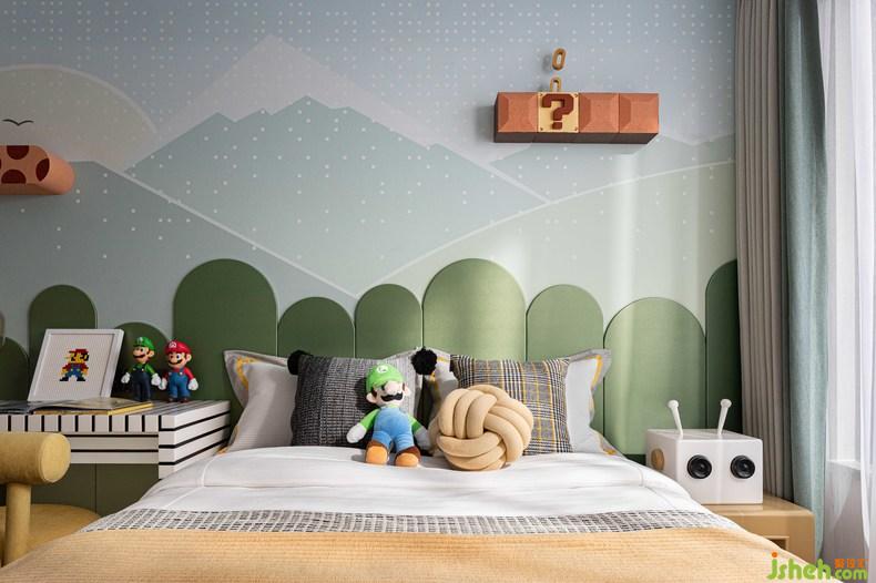 儿童房丨小朋友喜爱的超级马里奥主题的空间,森林的绿意充满着清新之感,利用游戏元素改造成储物格及玩具,趣味与功能兼容,童趣盎然。