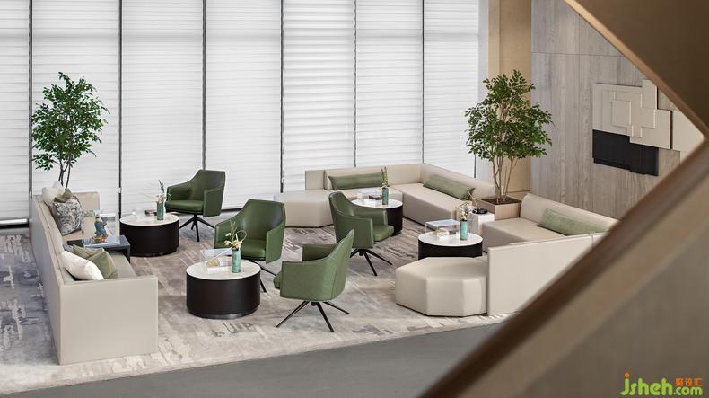 深度洽谈区 丨米白与绿意生机交织蔓延,优雅闲适流动在空间的线条与缝隙中,装修设计线条感的组合沙发,既满足视觉与感觉的舒适感,也满足场地功性能使用、灵活多变的需求。