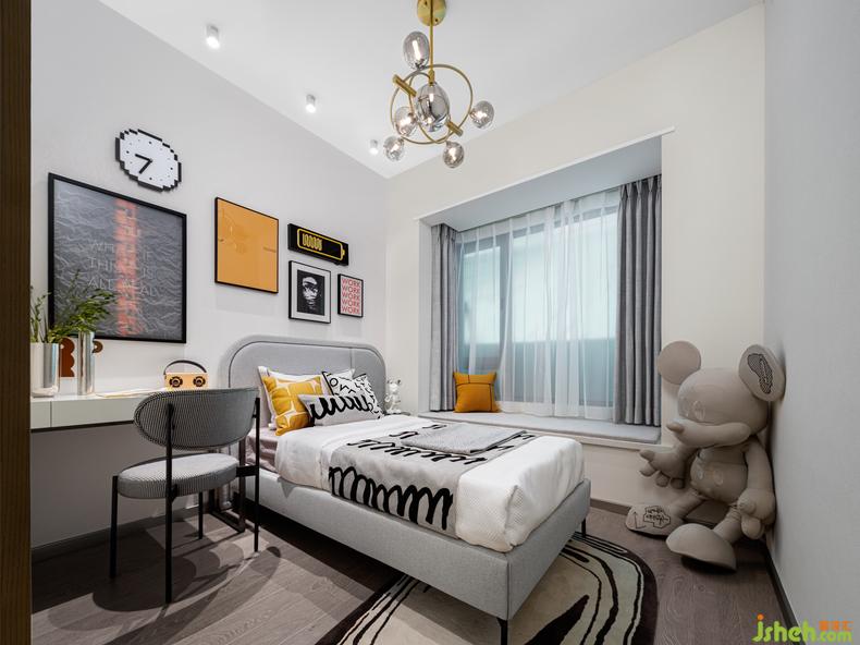为孩子准备玩乐空间的同时也少不了丰富色彩与可爱元素的融入,室内设计师洒满阳光的飘窗,油画手绘的艺术、图书桌几的置景、米老鼠玩偶的童趣,陪伴孩子成长,让孩子发挥足够的创意。