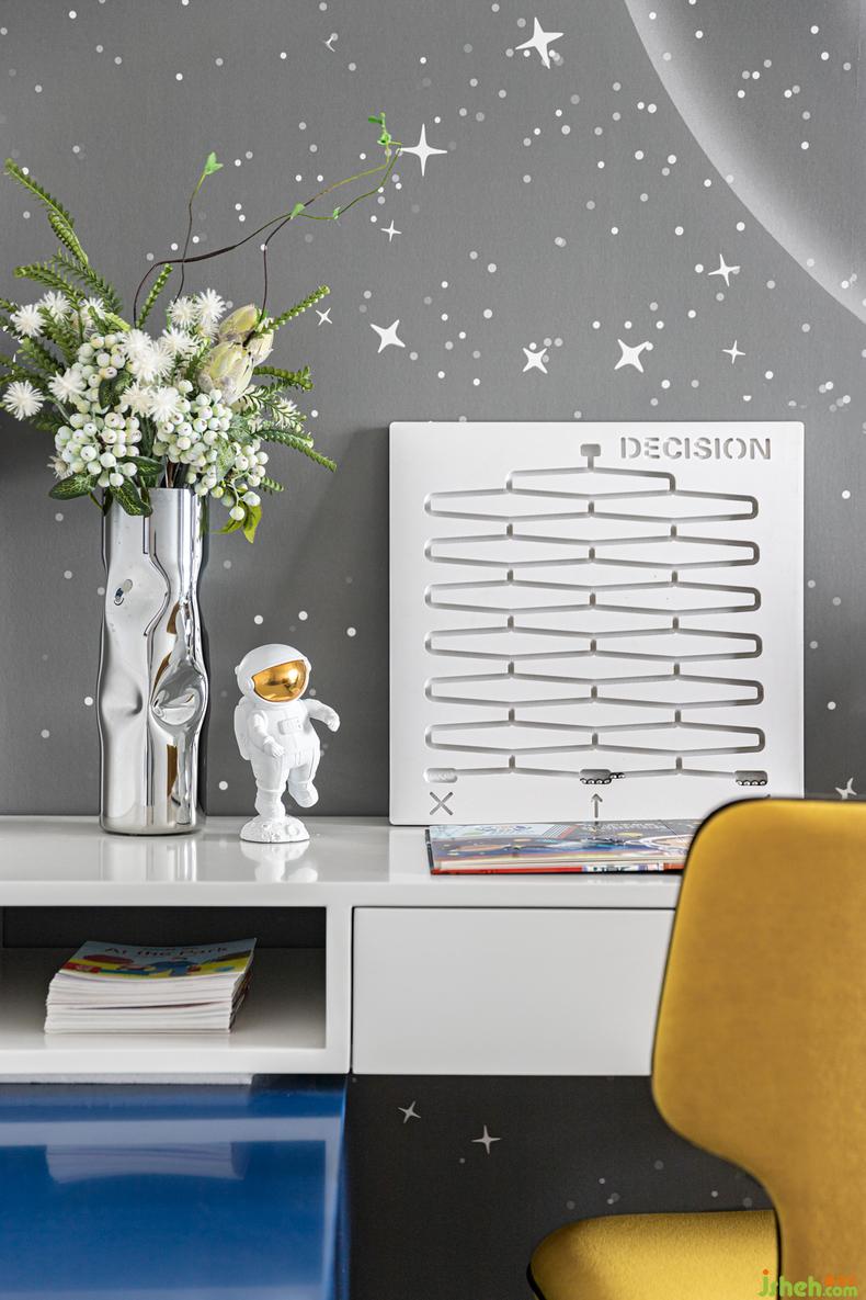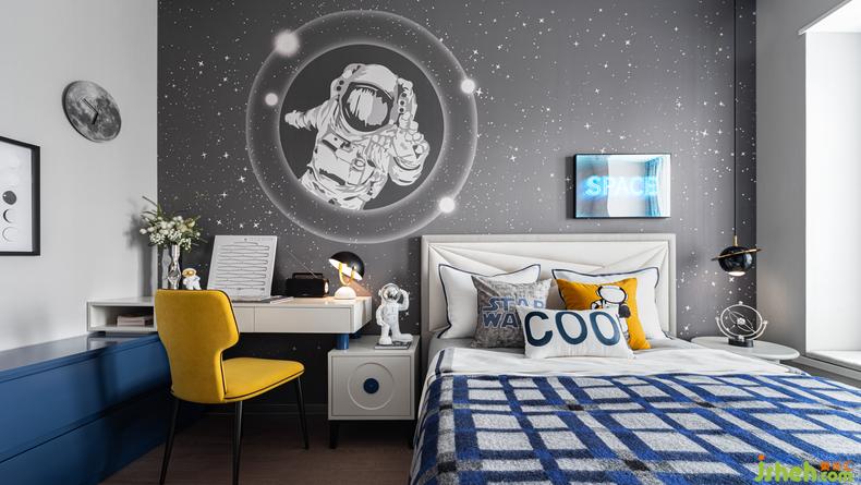 儿童房用多维的元素传递情感,标注性的蓝色气息让孩子的成长充满未来气息,宇航员的墙体视觉更让孩子热爱得以肆意延续,配以童趣设计感十足的物品装饰,让空间不仅有爱更充满活力。
