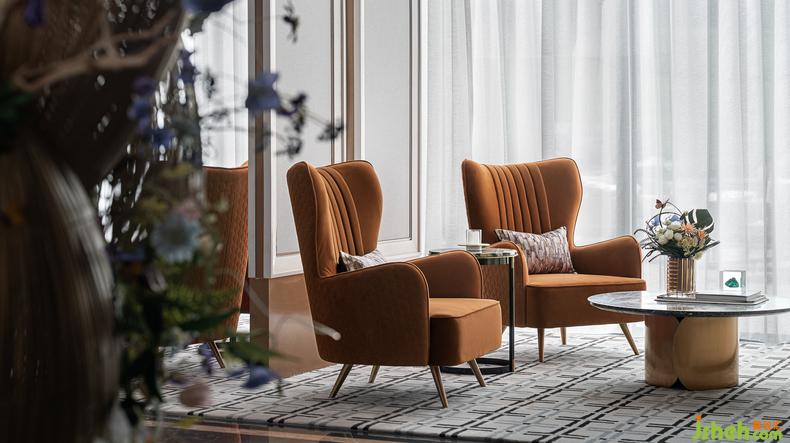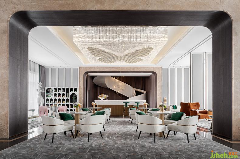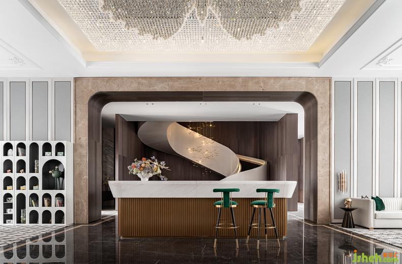 水吧区丨 呼应着中厅与洽谈区的秩序基调,室内设计师线面的结合让质感细腻通透,抬眼望去蝴蝶形态的水晶吊让人恍若步入不同时空的涟漪,让空间和感官都被代入了再次沟通自然的意识流里,即使移动在不同的角度里都会拥有让人着迷的视界。