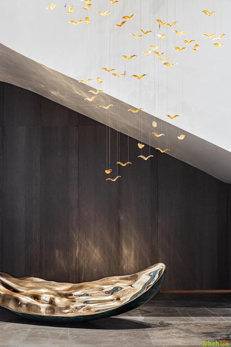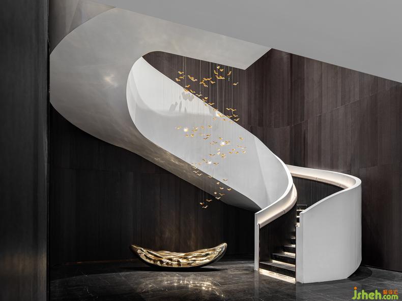 楼梯中厅丨 流畅的曲线勾勒时空的转换,垂落而下的鎏金飞鸟为自然的韵味中增加了奢雅的灵感,金属色调的坐歇布景,让空间幻化出光的璀璨,美的梦境。