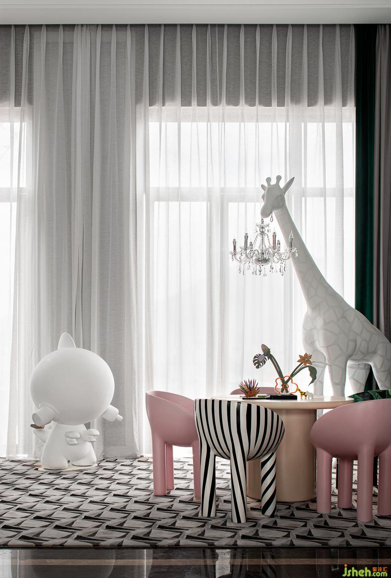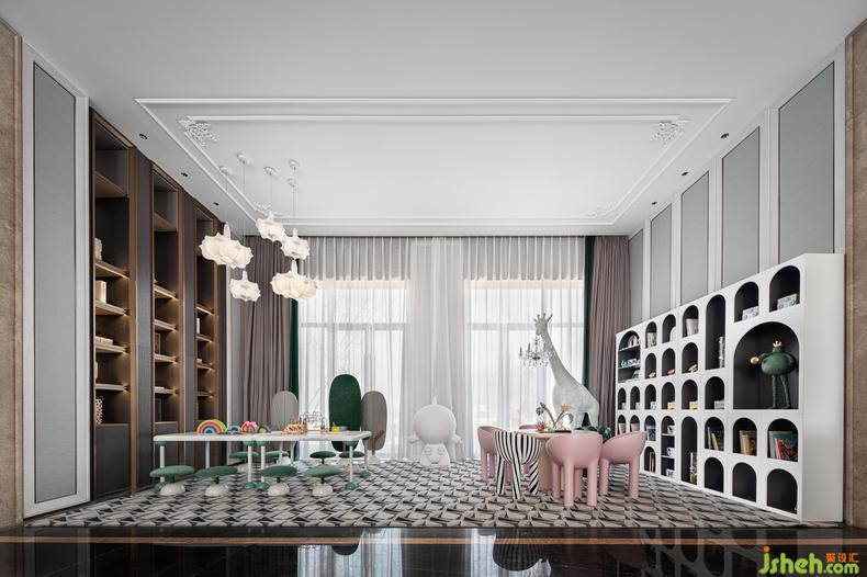 如果说凡尔赛风格最具特色的所在是什么,那莫过于随处可见的「弧拱」在风格上的应用,儿童乐园的打造选用了这一亮眼的格局,将柔和的色调和满铺的图形兼容,搭配动物的模型,童趣的摆件,为孩子呈现了一个畅游在异国风情的玩乐空间。
