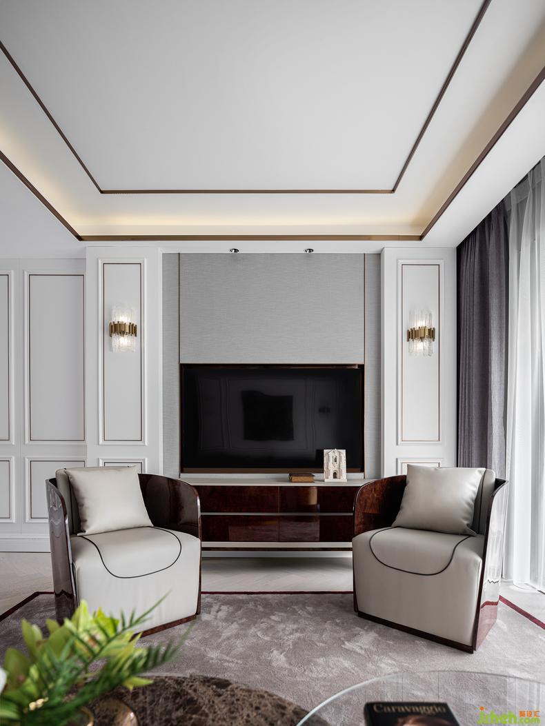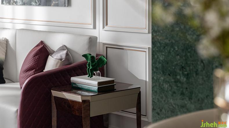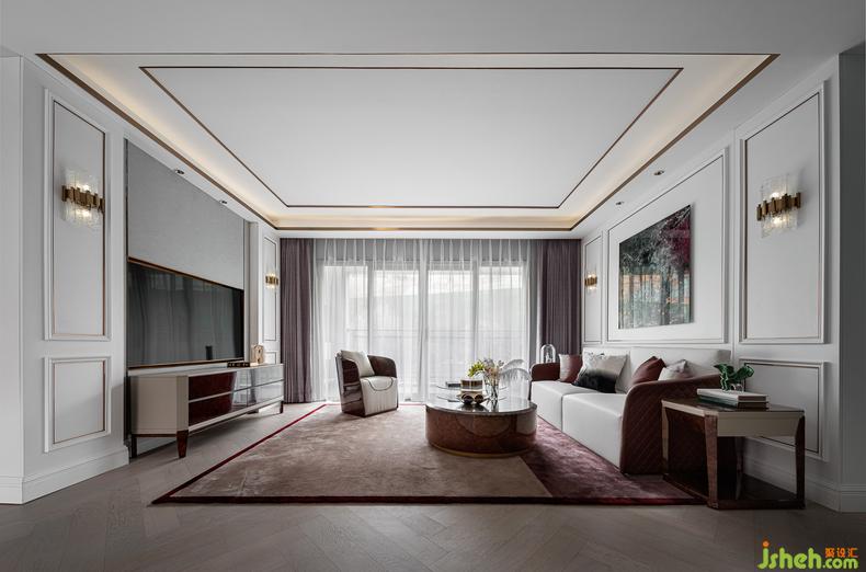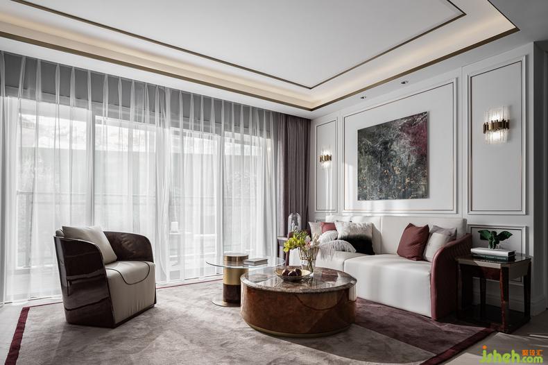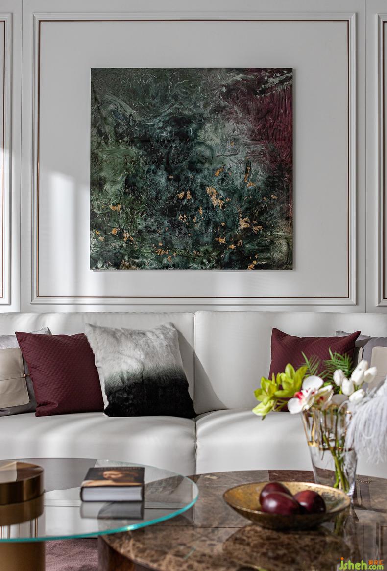 全景落地窗带来的瞩目画卷,纯白色调铺陈的背景光泽,室内设计师内敛神秘的材质肌理,皮革沙发带来的高端享受,丝绒酒红搭配的极致典雅,线条分明又充满层次,于简约之中流露着低调奢华的气息。