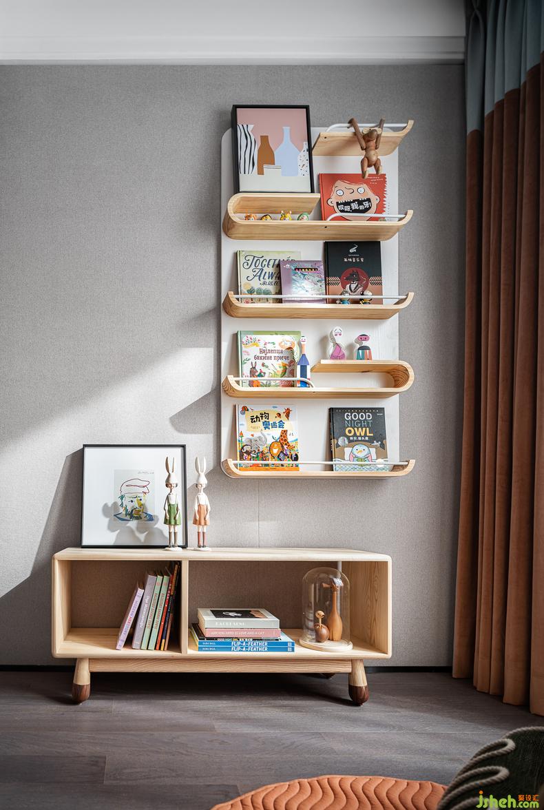 橙黄的雀跃在儿童房的涂鸦中被淋漓尽致的彰显,可爱的帐篷充满了童趣,同色系的窗帘开启这个创意的空间,原木拼接的置物造型满载着无限的热爱。