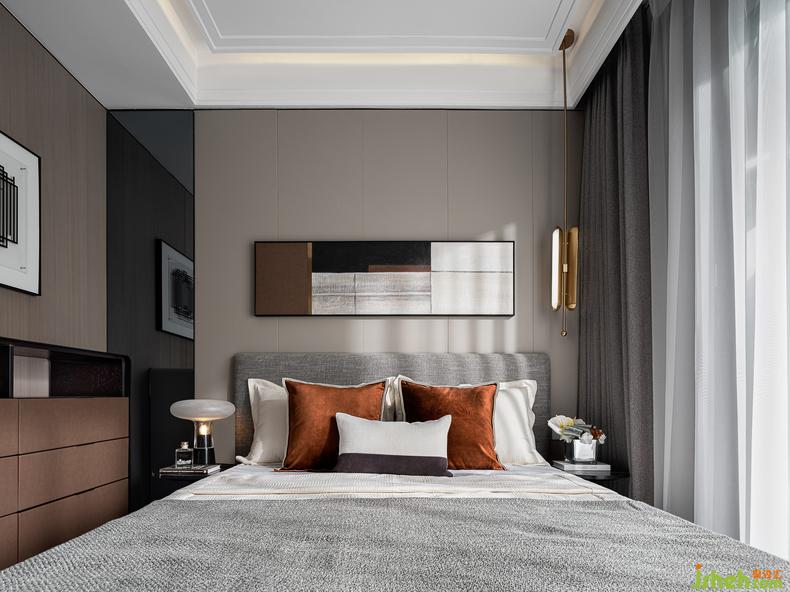 沿用与主卧统一的色调,在空间内将睡眠区域做到无限的放大,引入落地的窗景,搭配简洁的配饰,些许色彩点缀其间,制造出一抹反差与惊喜,严格按照主人对现代审美的判断,平衡视觉的感知。