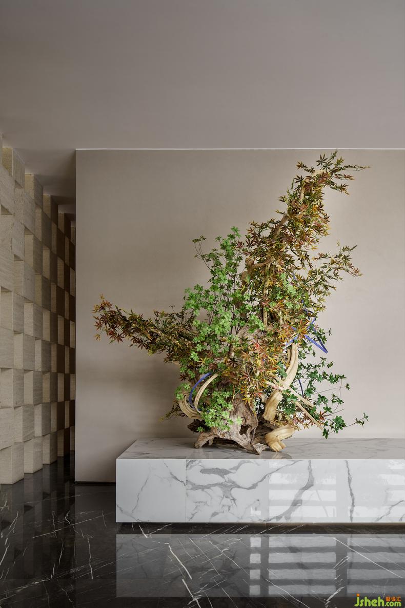 打造沉浸式的居享环境,要让居者在踏入这里的第一步就对生活充满幻想,如海的度量,强化了空间对于大尺度的界定,金属色度与白纹云石的空间布局,用空间秩序重组体验的结构,给喧嚣到僻静,世俗到旷然一个仪式的转合,让海的诗篇从第一章开始就有观照内心的留白。