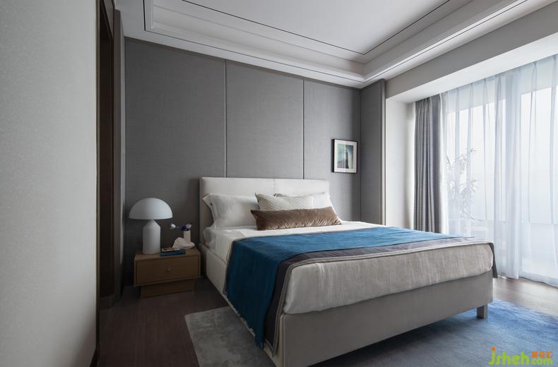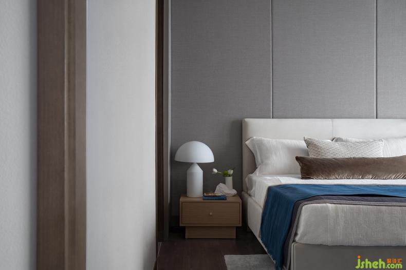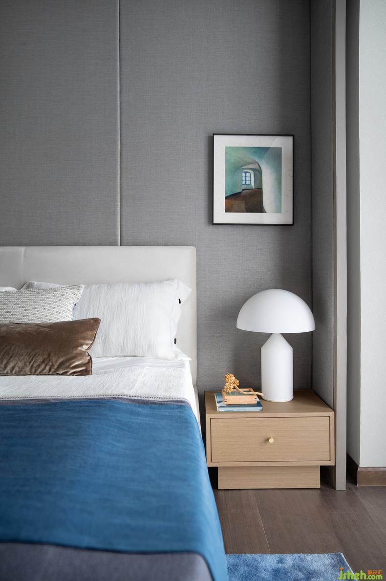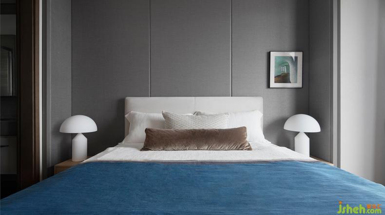 主卧丨男主人如山一样稳重,女主人如海一样纯粹,根据他们的个性打造了这样的空间,室内设计师灰调与蓝调给予了空间无尽的包容性,倾听静谧与自然,用一抹随性的画作、一盏异形的辅灯,为空间增添无尽的艺术魅力。