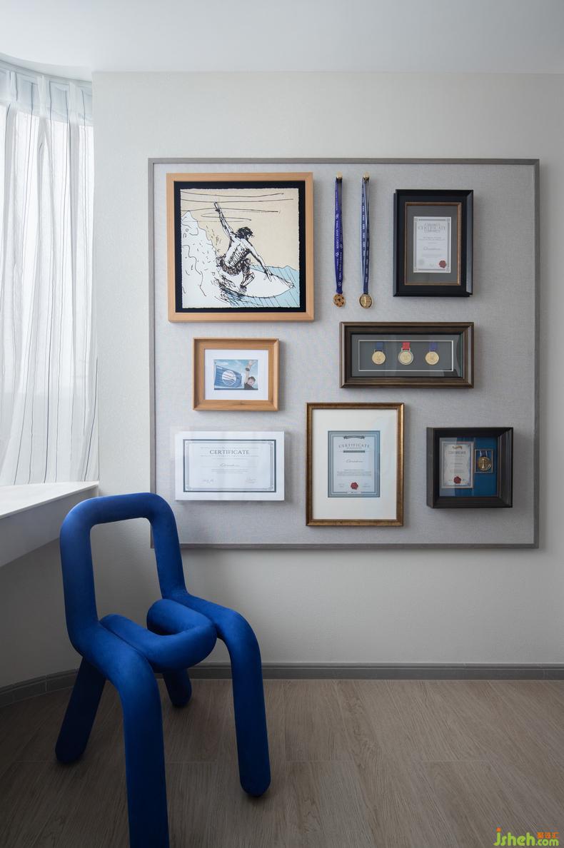 这个空间承载他成长中所有的美好瞬间,售楼处设计满墙的荣誉背后是说不完的故事,左上角的挂画是爸爸的插画师朋友画的冲浪的他;鲸蓝椅旁放置着他最爱的冲浪板,那是他12岁时夺冠获得的奖品,空间里处处都彰显着属于小主人的个性,在生活之上用热爱丰满人生的意义。