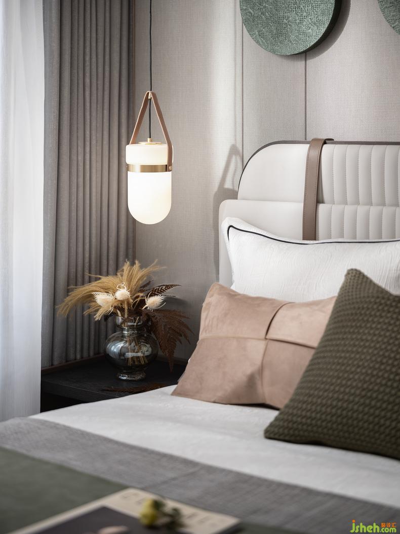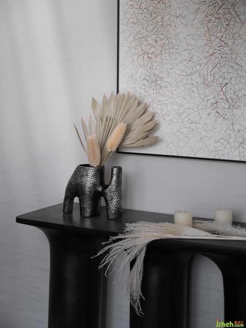 床头挂画丨贾娜娜(Janaina Mello Landini)所创作,样板房设计树枝艺术装置让人联想到缠绕在一起的树枝具有生机与灵动,墙上开绽茂盛的树枝仿佛有着属于独特的淡雅木香,清新明朗枝形艺术边几高低不一,象征着树木日日向上,生生不息。