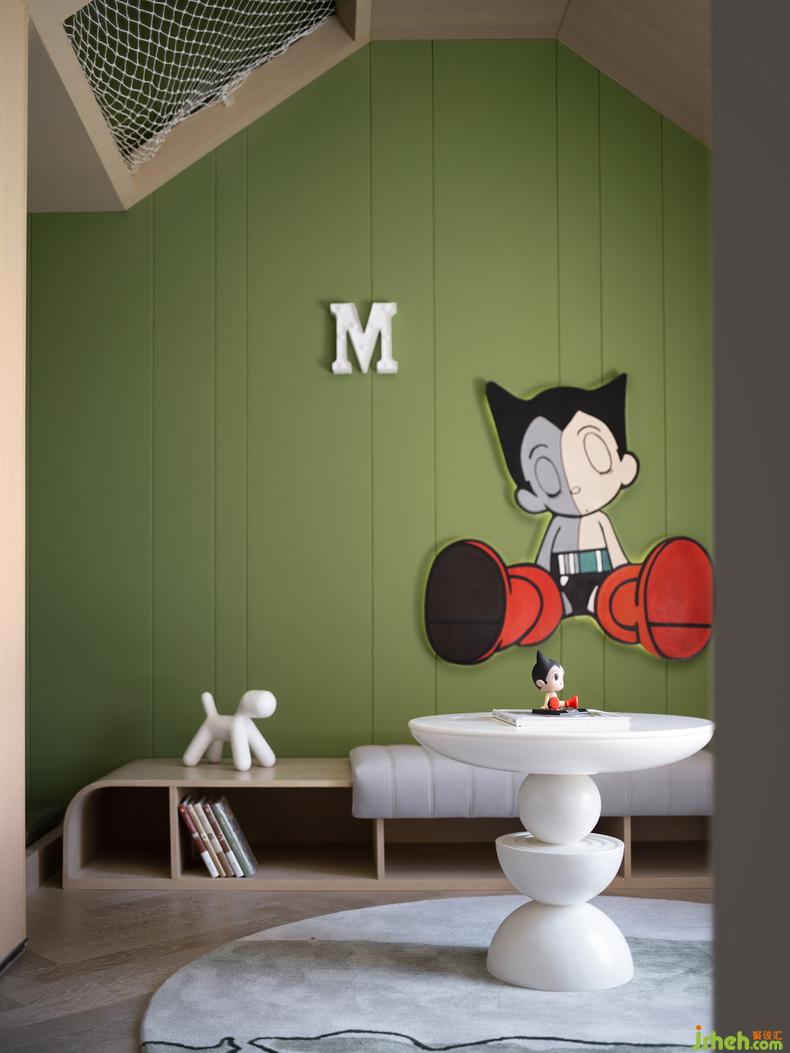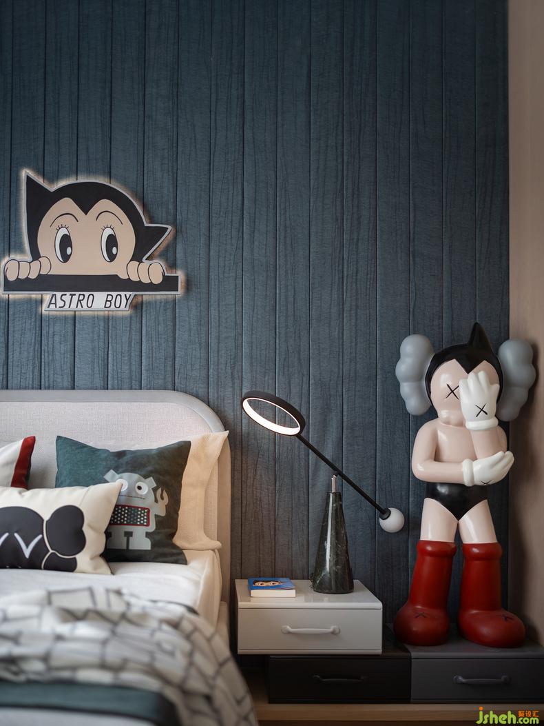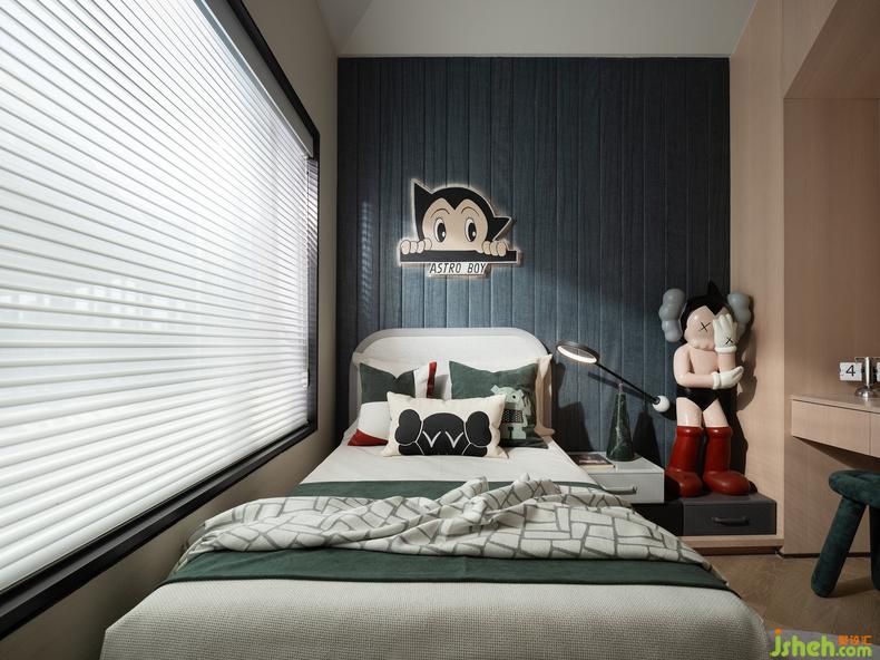 儿童房延续简约的设计氛围,样板房设计通过太空灰色调与阿童木元素的童趣搭配,多功能的书台与置物,让美感和趣味在这个空间里自在蔓延,给成长多一分轻松与欢快。